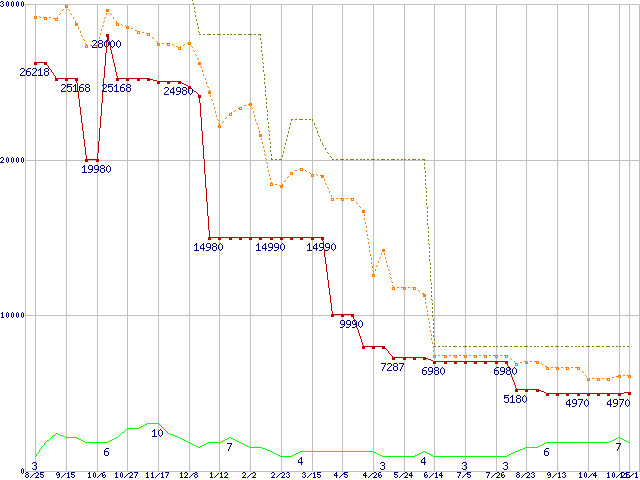 ※このグラフは過去のデータも税率5%相当に調整した税込み相当額のグラフです。 税率変更や、総額表示方式導入(2004年4月)の影響は除いています。 | | | ●凡例 | 最安値 (点線部は販売店未確認 または未調査) | 平均値 | 最高値 | ショップ数 |