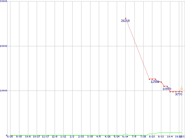 ※このグラフは過去のデータも税率5%相当に調整した税込み相当額のグラフです。 税率変更や、総額表示方式導入(2004年4月)の影響は除いています。 | | | ●凡例 | 最安値 (点線部は販売店未確認 または未調査) | 平均値 | 最高値 | ショップ数 |