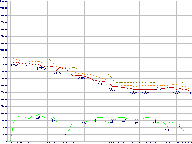 ※このグラフは過去のデータも税率5%相当に調整した税込み相当額のグラフです。 税率変更や、総額表示方式導入(2004年4月)の影響は除いています。 | | | ●凡例 | 最安値 (点線部は販売店未確認 または未調査) | 平均値 | 最高値 | ショップ数 |