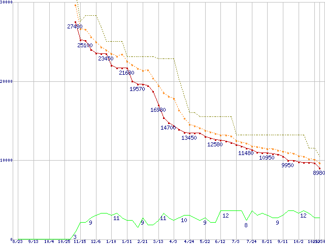 ※このグラフは過去のデータも税率5%相当に調整した税込み相当額のグラフです。 税率変更や、総額表示方式導入(2004年4月)の影響は除いています。 | | | ●凡例 | 最安値 (点線部は販売店未確認 または未調査) | 平均値 | 最高値 | ショップ数 |