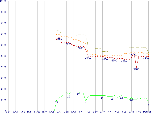 ※このグラフは過去のデータも税率5%相当に調整した税込み相当額のグラフです。 税率変更や、総額表示方式導入(2004年4月)の影響は除いています。 | | | ●凡例 | 最安値 (点線部は販売店未確認 または未調査) | 平均値 | 最高値 | ショップ数 |