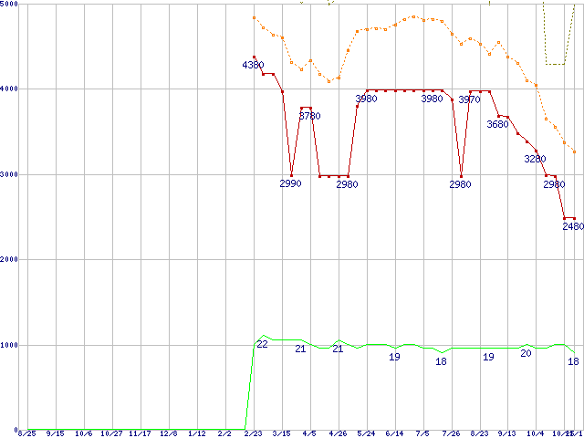 ※このグラフは過去のデータも税率5%相当に調整した税込み相当額のグラフです。 税率変更や、総額表示方式導入(2004年4月)の影響は除いています。 | | | ●凡例 | 最安値 (点線部は販売店未確認 または未調査) | 平均値 | 最高値 | ショップ数 |