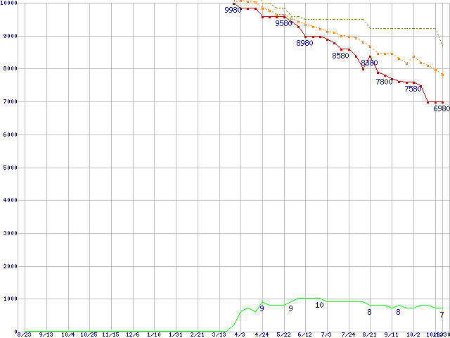 ※このグラフは過去のデータも税率5%相当に調整した税込み相当額のグラフです。 税率変更や、総額表示方式導入(2004年4月)の影響は除いています。 | | | ●凡例 | 最安値 (点線部は販売店未確認 または未調査) | 平均値 | 最高値 | ショップ数 |