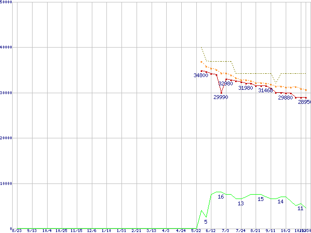 ※このグラフは過去のデータも税率5%相当に調整した税込み相当額のグラフです。 税率変更や、総額表示方式導入(2004年4月)の影響は除いています。 | | | ●凡例 | 最安値 (点線部は販売店未確認 または未調査) | 平均値 | 最高値 | ショップ数 |