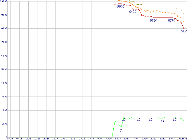 | Athlon X2 4850e (2.5GHz,L2 512KB×2)の価格推移 | | | (2007年8月24日~2008年10月31日) |
