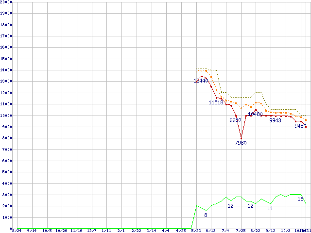 ※このグラフは過去のデータも税率5%相当に調整した税込み相当額のグラフです。 税率変更や、総額表示方式導入(2004年4月)の影響は除いています。 | | | ●凡例 | 最安値 (点線部は販売店未確認 または未調査) | 平均値 | 最高値 | ショップ数 |