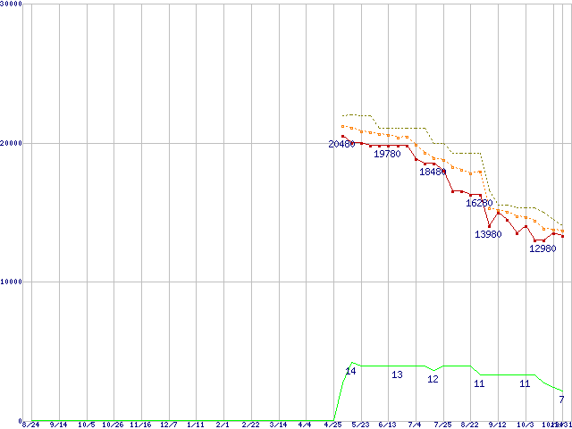 ※このグラフは過去のデータも税率5%相当に調整した税込み相当額のグラフです。 税率変更や、総額表示方式導入(2004年4月)の影響は除いています。 | | | ●凡例 | 最安値 (点線部は販売店未確認 または未調査) | 平均値 | 最高値 | ショップ数 |