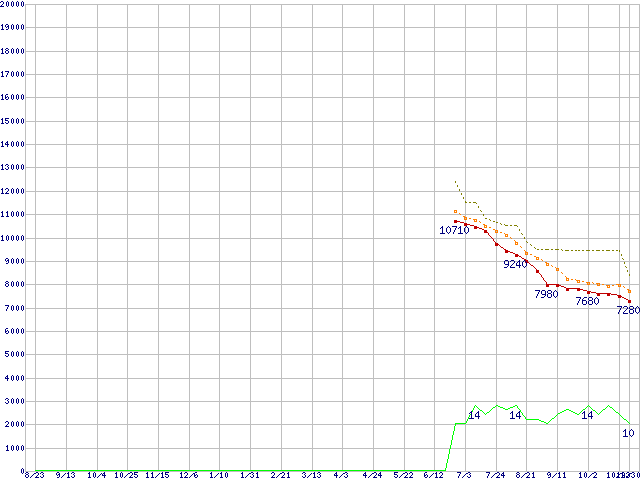 ※このグラフは過去のデータも税率5%相当に調整した税込み相当額のグラフです。 税率変更や、総額表示方式導入(2004年4月)の影響は除いています。 | | | ●凡例 | 最安値 (点線部は販売店未確認 または未調査) | 平均値 | 最高値 | ショップ数 |