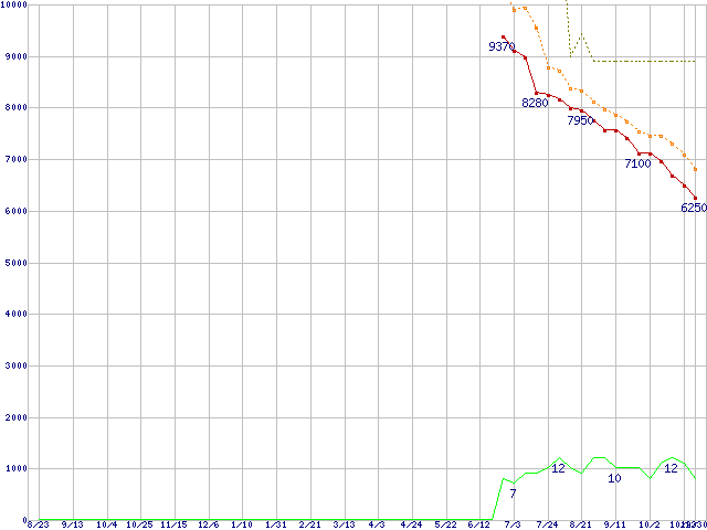 ※このグラフは過去のデータも税率5%相当に調整した税込み相当額のグラフです。 税率変更や、総額表示方式導入(2004年4月)の影響は除いています。 | | | ●凡例 | 最安値 (点線部は販売店未確認 または未調査) | 平均値 | 最高値 | ショップ数 |