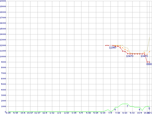 ※このグラフは過去のデータも税率5%相当に調整した税込み相当額のグラフです。 税率変更や、総額表示方式導入(2004年4月)の影響は除いています。 | | | ●凡例 | 最安値 (点線部は販売店未確認 または未調査) | 平均値 | 最高値 | ショップ数 |
