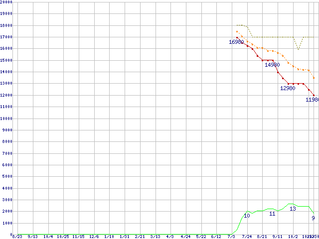 ※このグラフは過去のデータも税率5%相当に調整した税込み相当額のグラフです。 税率変更や、総額表示方式導入(2004年4月)の影響は除いています。 | | | ●凡例 | 最安値 (点線部は販売店未確認 または未調査) | 平均値 | 最高値 | ショップ数 |