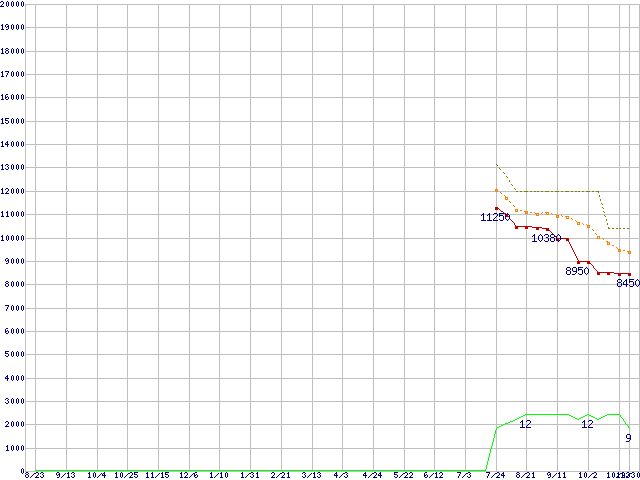 ※このグラフは過去のデータも税率5%相当に調整した税込み相当額のグラフです。 税率変更や、総額表示方式導入(2004年4月)の影響は除いています。 | | | ●凡例 | 最安値 (点線部は販売店未確認 または未調査) | 平均値 | 最高値 | ショップ数 |