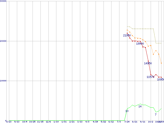 ※このグラフは過去のデータも税率5%相当に調整した税込み相当額のグラフです。 税率変更や、総額表示方式導入(2004年4月)の影響は除いています。 | | | ●凡例 | 最安値 (点線部は販売店未確認 または未調査) | 平均値 | 最高値 | ショップ数 |