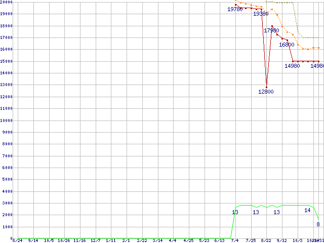 | Phenom X4 9150e (1.8GHz,L2 512KB×4,L3 2MB)の価格推移 | | | (2007年8月24日~2008年10月31日) |