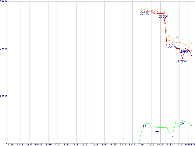 ※このグラフは過去のデータも税率5%相当に調整した税込み相当額のグラフです。 税率変更や、総額表示方式導入(2004年4月)の影響は除いています。 | | | ●凡例 | 最安値 (点線部は販売店未確認 または未調査) | 平均値 | 最高値 | ショップ数 |