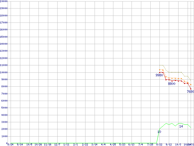 ※このグラフは過去のデータも税率5%相当に調整した税込み相当額のグラフです。 税率変更や、総額表示方式導入(2004年4月)の影響は除いています。 | | | ●凡例 | 最安値 (点線部は販売店未確認 または未調査) | 平均値 | 最高値 | ショップ数 |