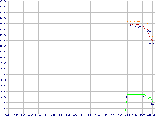 ※このグラフは過去のデータも税率5%相当に調整した税込み相当額のグラフです。 税率変更や、総額表示方式導入(2004年4月)の影響は除いています。 | | | ●凡例 | 最安値 (点線部は販売店未確認 または未調査) | 平均値 | 最高値 | ショップ数 |