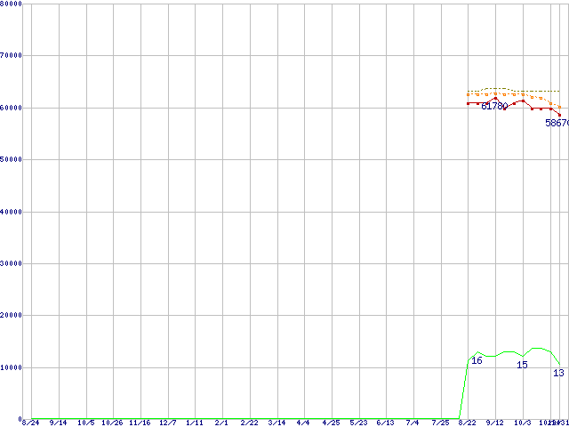 ※このグラフは過去のデータも税率5%相当に調整した税込み相当額のグラフです。 税率変更や、総額表示方式導入(2004年4月)の影響は除いています。 | | | ●凡例 | 最安値 (点線部は販売店未確認 または未調査) | 平均値 | 最高値 | ショップ数 |