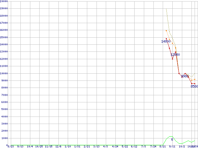 ※このグラフは過去のデータも税率5%相当に調整した税込み相当額のグラフです。 税率変更や、総額表示方式導入(2004年4月)の影響は除いています。 | | | ●凡例 | 最安値 (点線部は販売店未確認 または未調査) | 平均値 | 最高値 | ショップ数 |