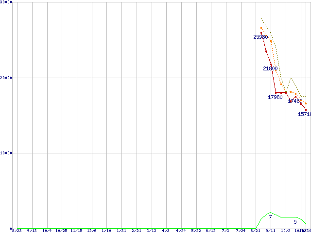 ※このグラフは過去のデータも税率5%相当に調整した税込み相当額のグラフです。 税率変更や、総額表示方式導入(2004年4月)の影響は除いています。 | | | ●凡例 | 最安値 (点線部は販売店未確認 または未調査) | 平均値 | 最高値 | ショップ数 |