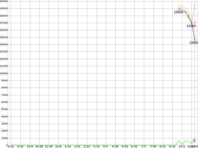 ※このグラフは過去のデータも税率5%相当に調整した税込み相当額のグラフです。 税率変更や、総額表示方式導入(2004年4月)の影響は除いています。 | | | ●凡例 | 最安値 (点線部は販売店未確認 または未調査) | 平均値 | 最高値 | ショップ数 |