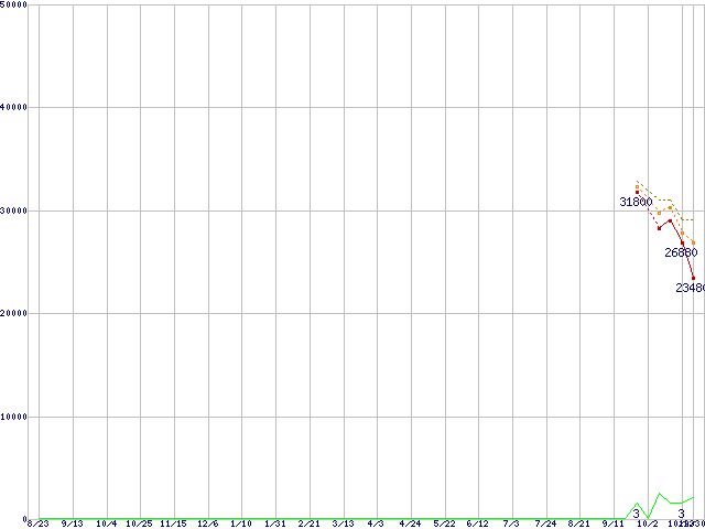 ※このグラフは過去のデータも税率5%相当に調整した税込み相当額のグラフです。 税率変更や、総額表示方式導入(2004年4月)の影響は除いています。 | | | ●凡例 | 最安値 (点線部は販売店未確認 または未調査) | 平均値 | 最高値 | ショップ数 |