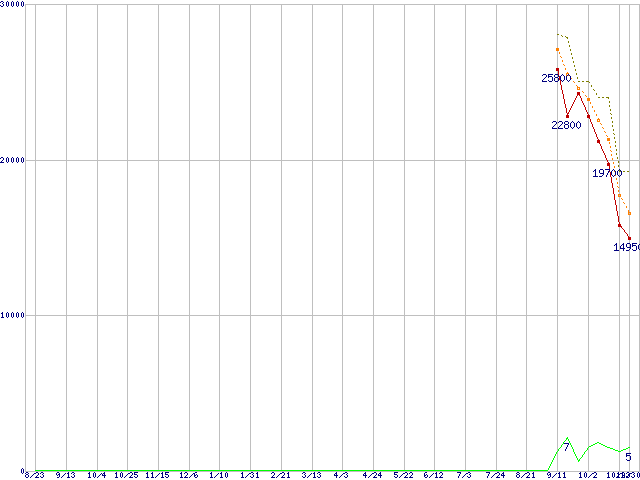 ※このグラフは過去のデータも税率5%相当に調整した税込み相当額のグラフです。 税率変更や、総額表示方式導入(2004年4月)の影響は除いています。 | | | ●凡例 | 最安値 (点線部は販売店未確認 または未調査) | 平均値 | 最高値 | ショップ数 |