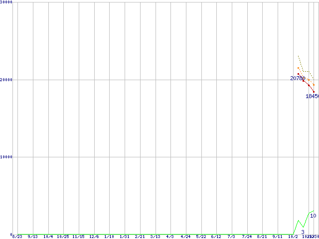 ※このグラフは過去のデータも税率5%相当に調整した税込み相当額のグラフです。 税率変更や、総額表示方式導入(2004年4月)の影響は除いています。 | | | ●凡例 | 最安値 (点線部は販売店未確認 または未調査) | 平均値 | 最高値 | ショップ数 |
