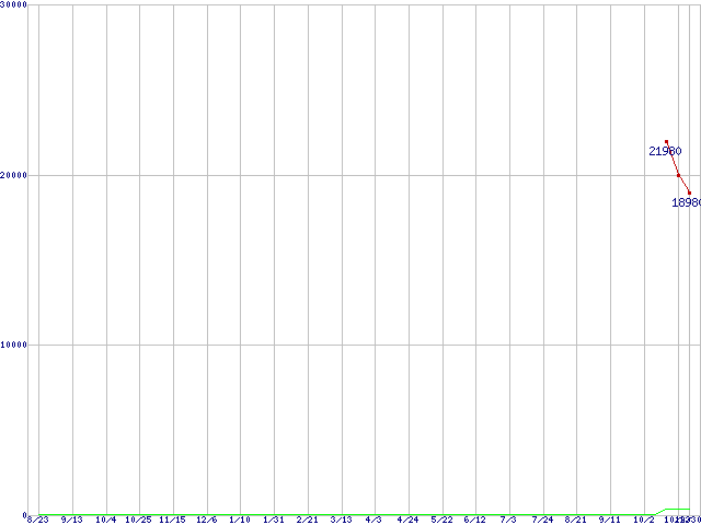 ※このグラフは過去のデータも税率5%相当に調整した税込み相当額のグラフです。 税率変更や、総額表示方式導入(2004年4月)の影響は除いています。 | | | ●凡例 | 最安値 (点線部は販売店未確認 または未調査) | 平均値 | 最高値 | ショップ数 |