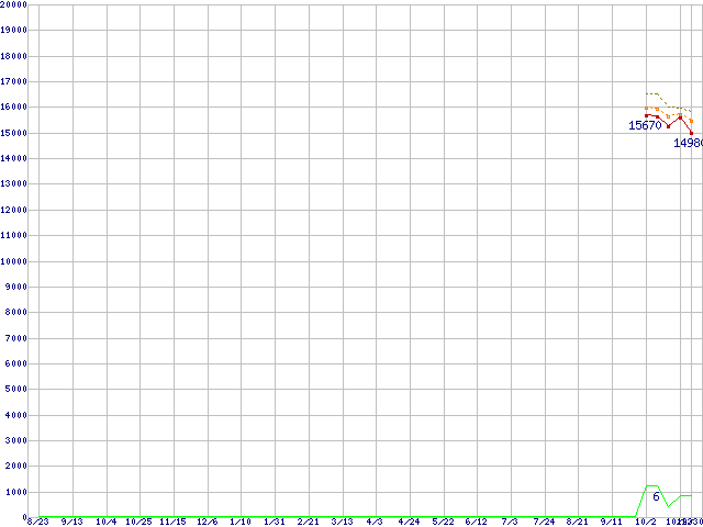 ※このグラフは過去のデータも税率5%相当に調整した税込み相当額のグラフです。 税率変更や、総額表示方式導入(2004年4月)の影響は除いています。 | | | ●凡例 | 最安値 (点線部は販売店未確認 または未調査) | 平均値 | 最高値 | ショップ数 |
