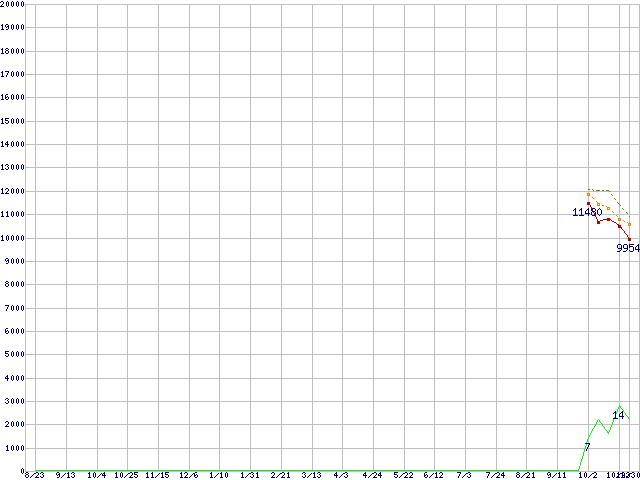 ※このグラフは過去のデータも税率5%相当に調整した税込み相当額のグラフです。 税率変更や、総額表示方式導入(2004年4月)の影響は除いています。 | | | ●凡例 | 最安値 (点線部は販売店未確認 または未調査) | 平均値 | 最高値 | ショップ数 |