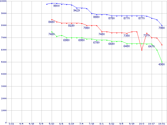 | Socket AM2 (HyperTransport,Dual Core,TDP 45W)の最安値推移 | | | (2008年3月21日~2008年10月31日) |