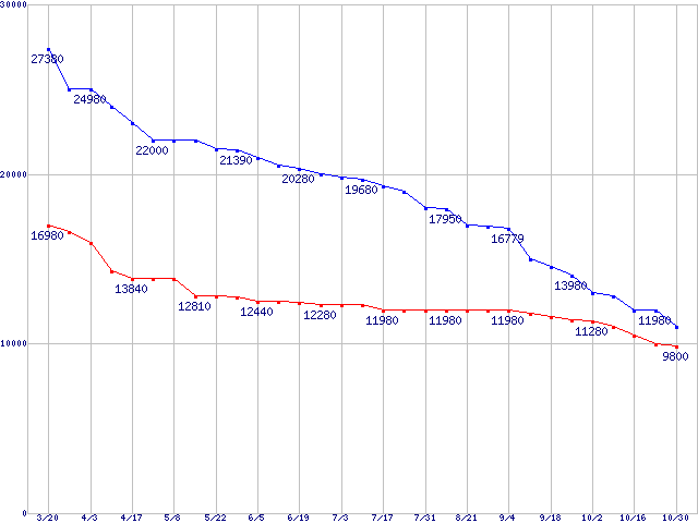 Deskstar P7K500 (7200rpm,3Gb/s)の最安値推移