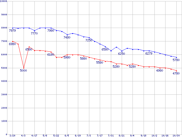 Deskstar P7K500 (7200rpm,3Gb/s)の最安値推移