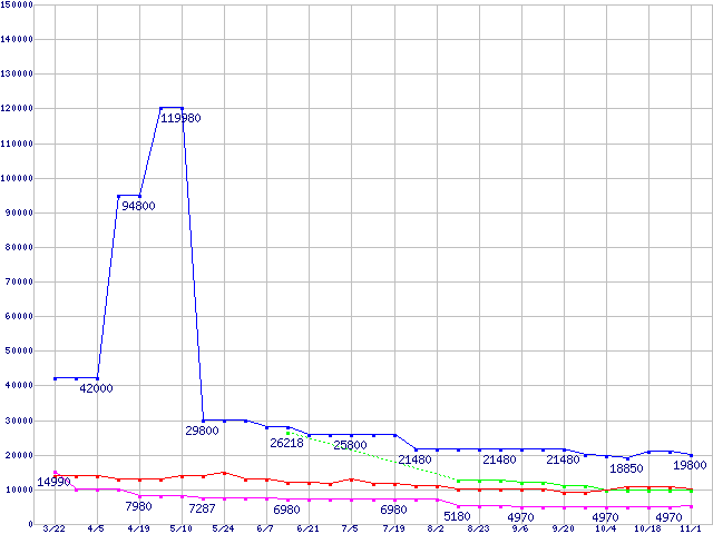 PC3-12800(DDR3-1600) DDR3 SDRAM DIMMの最安値推移