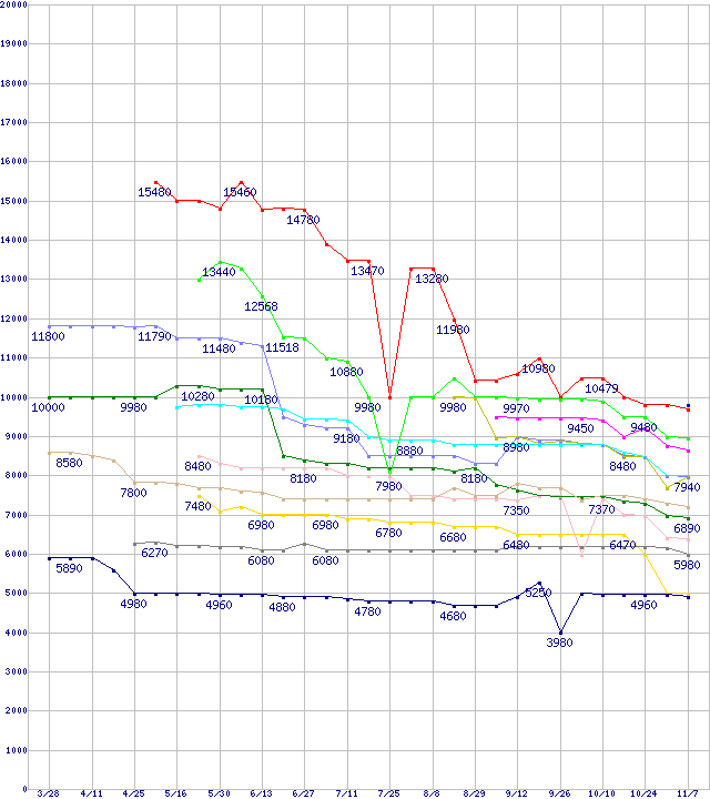 | CPU主要製品(最安値1万円未満)の最安値推移 | | | (2008年3月28日~2008年11月7日) |