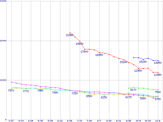 HDD 600~750GB未満の最安値推移