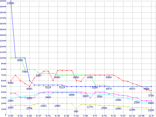 メモリ主要製品(最安値5千円未満)の最安値推移