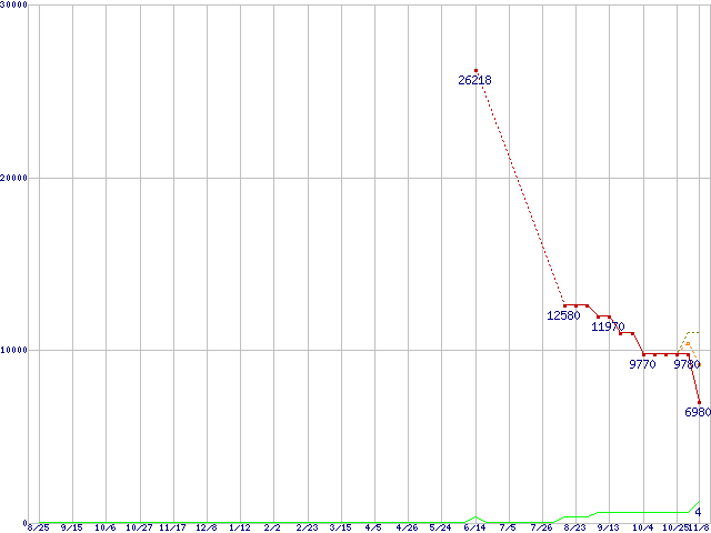 ※このグラフは過去のデータも税率5%相当に調整した税込み相当額のグラフです。 税率変更や、総額表示方式導入(2004年4月)の影響は除いています。 | | | ●凡例 | 最安値 (点線部は販売店未確認 または未調査) | 平均値 | 最高値 | ショップ数 |