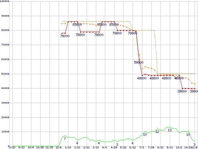 ※このグラフは過去のデータも税率5%相当に調整した税込み相当額のグラフです。 税率変更や、総額表示方式導入(2004年4月)の影響は除いています。 | | | ●凡例 | 最安値 (点線部は販売店未確認 または未調査) | 平均値 | 最高値 | ショップ数 |
