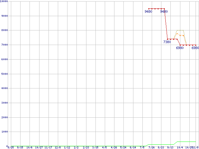 ※このグラフは過去のデータも税率5%相当に調整した税込み相当額のグラフです。 税率変更や、総額表示方式導入(2004年4月)の影響は除いています。 | | | ●凡例 | 最安値 (点線部は販売店未確認 または未調査) | 平均値 | 最高値 | ショップ数 |