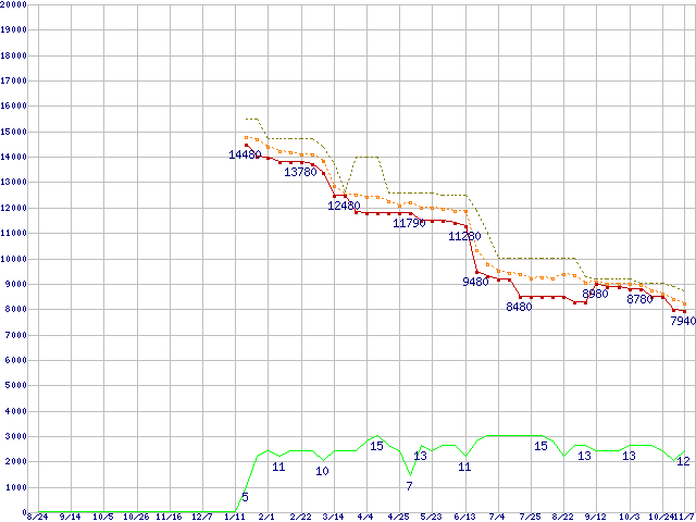 | Athlon X2 5400 (2.8GHz,L2 512KB×2)の価格推移 | | | (2007年8月24日~2008年11月7日) |