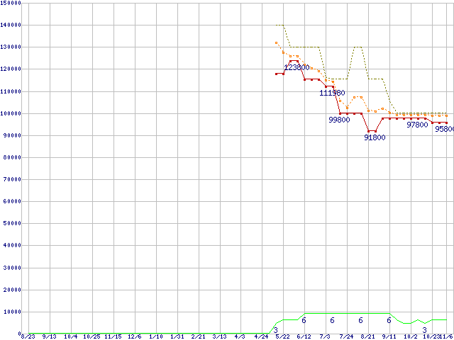 ※このグラフは過去のデータも税率5%相当に調整した税込み相当額のグラフです。 税率変更や、総額表示方式導入(2004年4月)の影響は除いています。 | | | ●凡例 | 最安値 (点線部は販売店未確認 または未調査) | 平均値 | 最高値 | ショップ数 |