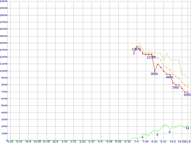 ※このグラフは過去のデータも税率5%相当に調整した税込み相当額のグラフです。 税率変更や、総額表示方式導入(2004年4月)の影響は除いています。 | | | ●凡例 | 最安値 (点線部は販売店未確認 または未調査) | 平均値 | 最高値 | ショップ数 |