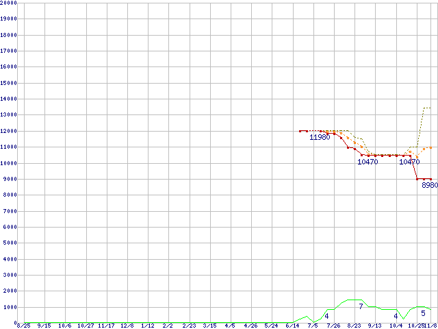 ※このグラフは過去のデータも税率5%相当に調整した税込み相当額のグラフです。 税率変更や、総額表示方式導入(2004年4月)の影響は除いています。 | | | ●凡例 | 最安値 (点線部は販売店未確認 または未調査) | 平均値 | 最高値 | ショップ数 |