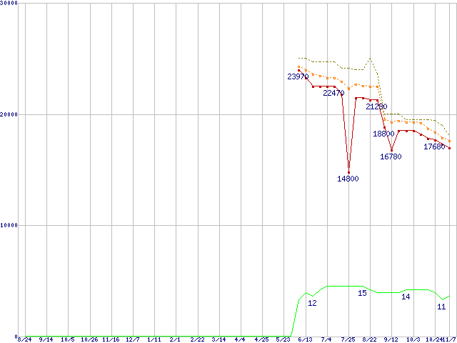 ※このグラフは過去のデータも税率5%相当に調整した税込み相当額のグラフです。 税率変更や、総額表示方式導入(2004年4月)の影響は除いています。 | | | ●凡例 | 最安値 (点線部は販売店未確認 または未調査) | 平均値 | 最高値 | ショップ数 |