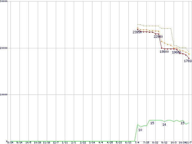 ※このグラフは過去のデータも税率5%相当に調整した税込み相当額のグラフです。 税率変更や、総額表示方式導入(2004年4月)の影響は除いています。 | | | ●凡例 | 最安値 (点線部は販売店未確認 または未調査) | 平均値 | 最高値 | ショップ数 |