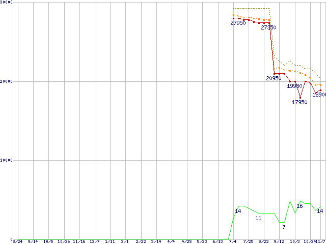 ※このグラフは過去のデータも税率5%相当に調整した税込み相当額のグラフです。 税率変更や、総額表示方式導入(2004年4月)の影響は除いています。 | | | ●凡例 | 最安値 (点線部は販売店未確認 または未調査) | 平均値 | 最高値 | ショップ数 |