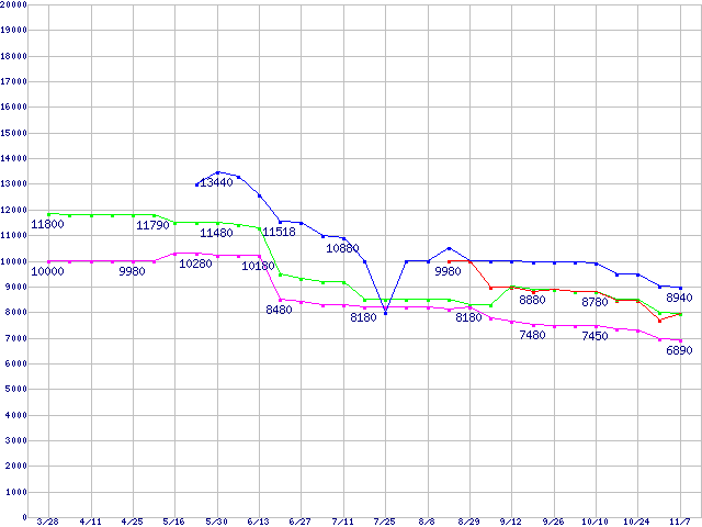 | Socket AM2 (HyperTransport,Dual Core,TDP 65W)の最安値推移 | | | (2008年3月28日~2008年11月7日) |