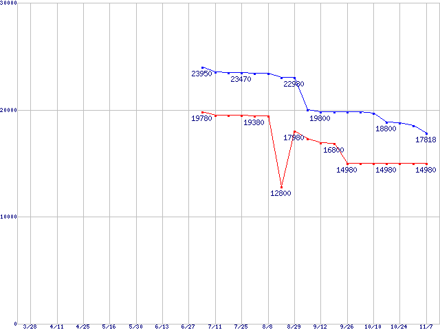 | Socket AM2 (HyperTransport 3.0,Quad Core,TDP 65W)の最安値推移 | | | (2008年3月28日~2008年11月7日) |